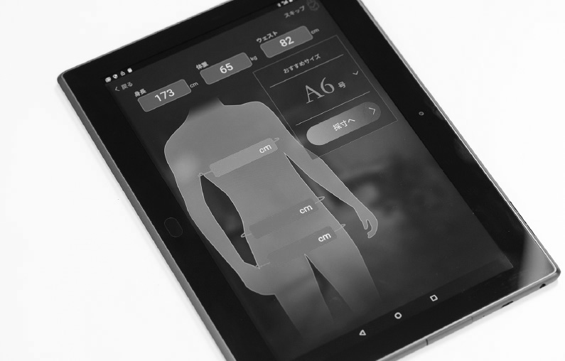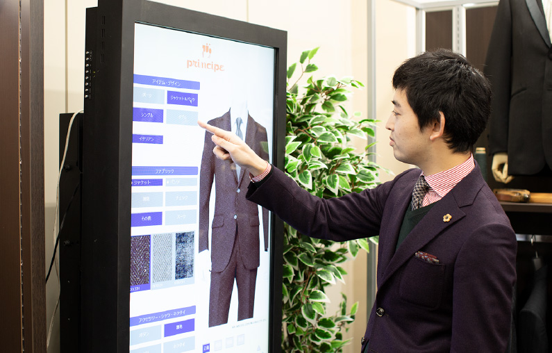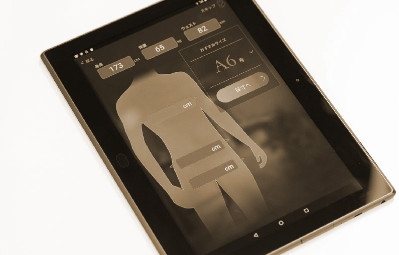 タブレットを活用した「AI生地レコメンドシステム」を店頭に導入。感性や印象から直感的にお好みのスタイルをAIが提案してくれます。初めてのオーダーにも寄り添え、自分だけのスタイルを見つけられるなど、お客さまのニーズに応える新しい接客ツール。店頭販売の活性化、信頼を得ることによるファンの構築に最適なシステムです。
